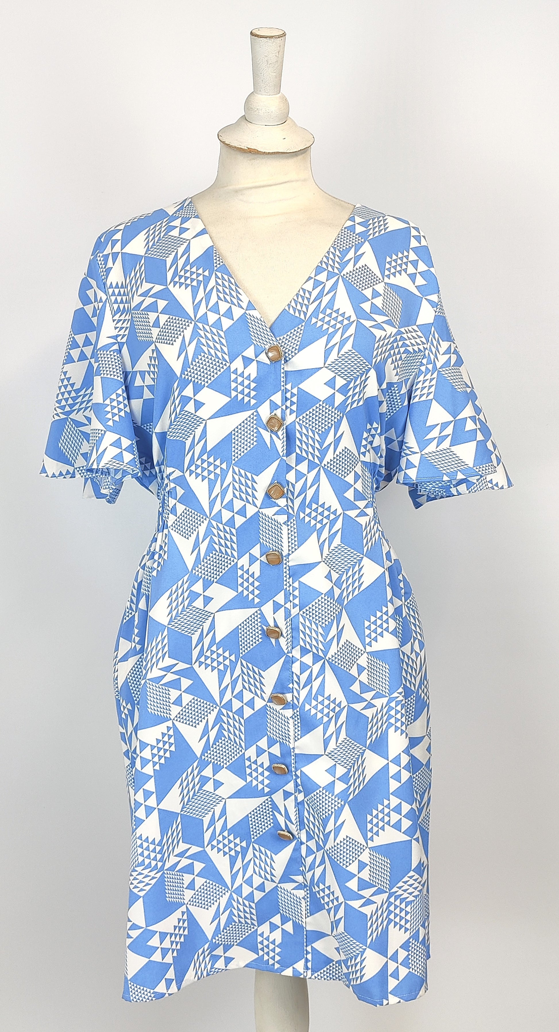 Blue and White geometric pattern with gold and pearl button detail